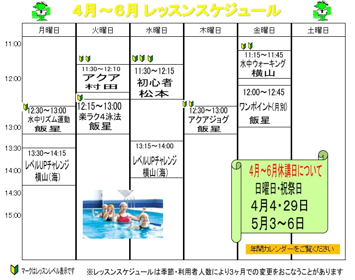 2026年4月~6月プールレッスンのスケジュール